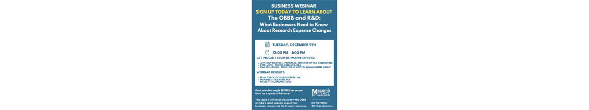 Join us for a focused webinar as experts from Rehmann break down the One Big Beautiful Bill and its impact on businesses. They’ll guide us through key takeaways and answer your questions during a live Q&A session.